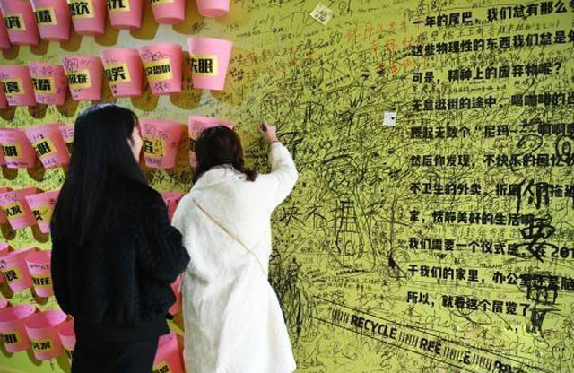除了這些垃圾收集裝置,垃圾箱內(nèi)的三面?zhèn)葔偷孛嬉渤蔀槭忻裥沟钠脚_,寫滿了戳心的留言。如“扔掉和我媽的溝通不暢”“2018我抑郁癥了,話更少了,希望你不要離開,一起去馬來西亞”……字字句句都反映出當(dāng)代年輕人的生活壓力,以及對輕松、快樂的渴望。