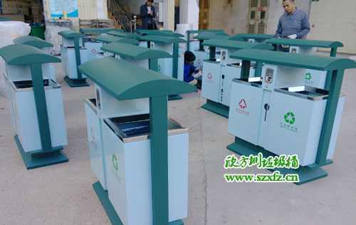深圳龍崗區(qū)街道辦采購(gòu)F95戶外鋼板分類垃圾桶,按照15天交貨日期,如期完工,送貨上門。此款F95戶外鋼板分類垃圾桶規(guī)格為:1000*400*1000.鋼制垃圾桶屋檐桶頭設(shè)計(jì),防止雨水傾入內(nèi)桶。煙頭投口,分類垃圾,隔絕火患。有害投口,充分利用空間。桶兩邊都絲印有,標(biāo)志,字體,不可回收字樣,采用紅顏色。 標(biāo)志,字體,可回收字樣,采用綠顏色。巧妙的設(shè)計(jì),結(jié)合城市人性化,更好服務(wù)城市居民。