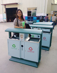 此款JP02分類環保垃圾箱的規格為:1030*420*1000mm采用新型的剪鈑下料,折彎、沖壓、焊接、打磨、等工藝: 表面經過除油、噴砂防銹處理后,再進行酸洗磷化處理;表面清理干燥后整體進行靜電噴涂,涂層厚度達到 90um,經過流水線高溫固化爐固化后再出爐冷卻,加工后的塑粉附著力強,不易剝落;投放口圓角處理,不會劃傷手,頂蓋流線型設計,不僅美觀,還預防了路人不小心碰撞磕傷。投放口還特意增加廢舊電池的投放口,能夠更好的起到環保環境的作用。