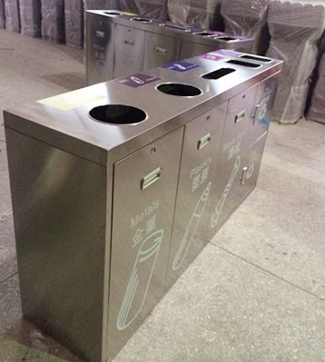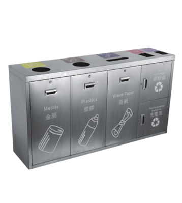 • 產品材質:不銹鋼五分類環保回收箱采用201#,202#,304#優質不銹鋼材料模壓成型,堅固耐用,不易破損;耐火安全,抗高低溫,適合各種惡劣氣候條件;金屬亮澤,高雅美觀,廣泛適用于各種場所;內外表面光潔,減少垃圾殘留,易于清潔;配置鍍鋅板內桶,便于垃圾清倒;