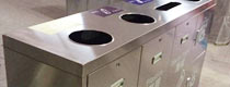 不銹鋼五分類環保回收箱采用優質不銹鋼材質制作,精細打磨確保邊角光滑無利口不傷手,垃圾形狀投口設計確保精準垃圾分類投放配三角鎖保護內桶