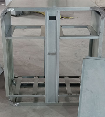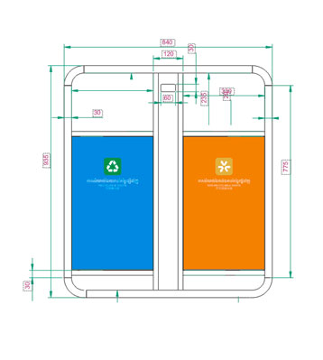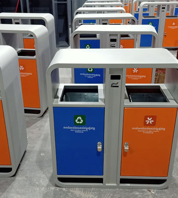 外筒鍍鋅板框架噴戶外淺灰色塑粉高溫烤漆,門板做藍色和橙色烤漆,分別對應可回收物和其他垃圾并絲印分類標,內筒與底座做隔層防潮,整體戶外擺放防銹耐用。