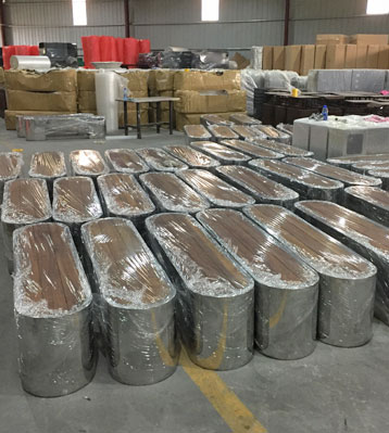 欣方圳不銹鋼長條橢圓休閑椅椅面原材料采用真空泵排除空氣、填充防腐液、加壓滲透、抽真空排出多余防腐液達到先進的防腐防蟲工藝。