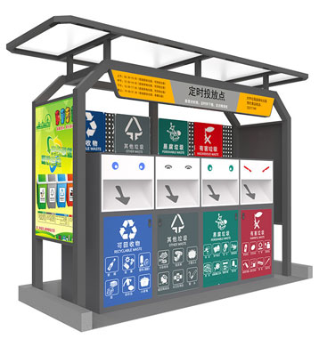 設有擋雨棚,可配備垃圾箱信息顯示屏、防水照明燈、廣告屏,進行地面硬化。對社區玻金塑紙可回收物,其他垃圾,廚余垃圾,有害垃圾等生活垃圾定時定點投放收集.