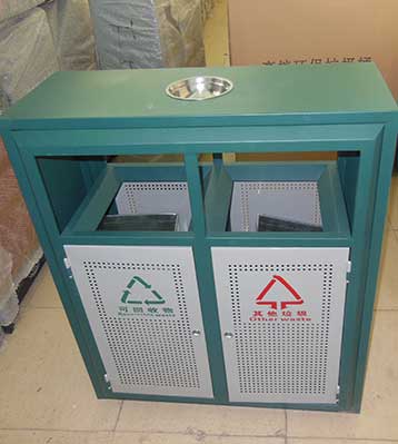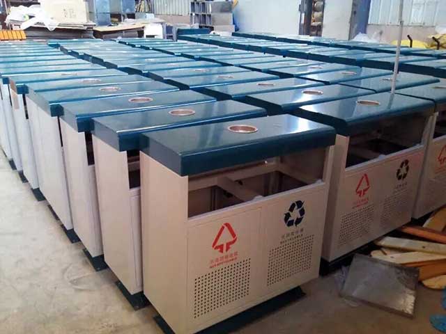 • 產品材質:欣方圳鋼板分類垃圾桶采用優質冷軋鋼材料經剪鈑下料、折彎、沖壓、焊接、打磨、等工藝:表面經過除油、噴砂防銹處理后,再進行酸洗磷化處理;表面清理干燥后整體進行靜電噴涂或烤漆處理,靜電噴涂是經過流水線高溫固化爐固化后再出爐冷卻,加工后的塑粉附著力強,不易剝落;