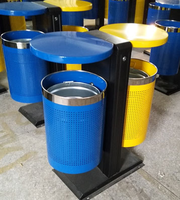 • 產品材質:戶外鋼板烤漆分類垃圾桶采用優質冷軋鋼材料經剪鈑下料、折彎、沖壓、焊接、打磨、等工藝:表面經過除油、噴砂防銹處理后,再進行酸洗磷化處理;表面清理干燥后整體進行靜電噴涂或烤漆處理,靜電噴涂是經過流水線高溫固化爐固化后再出爐冷卻,加工后的塑粉附著力強,不易剝落;